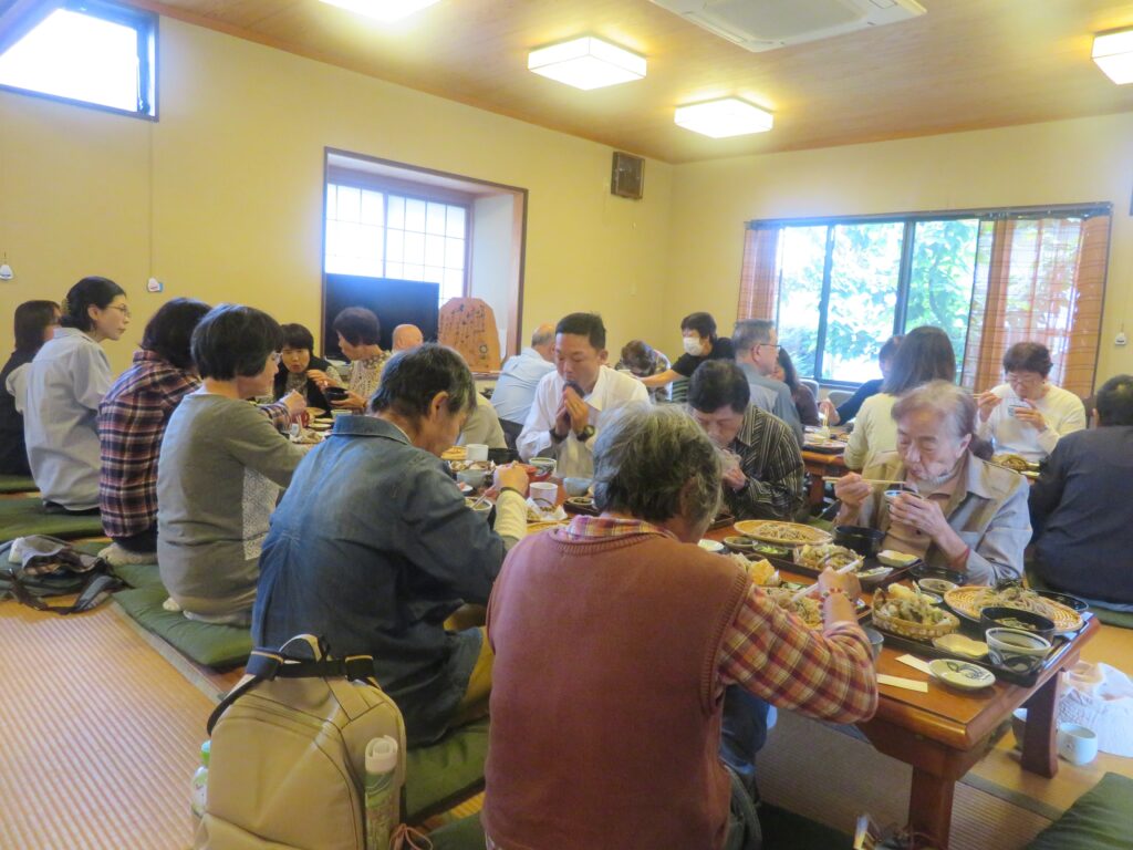 昼食は揚げたての天ぷらたっぷり「まいたけ定食」でした。食後、果樹園を散策した際、クマよけと思われる銃声(録音)が放送されていましたが、幸いクマには遭遇しませんでした。