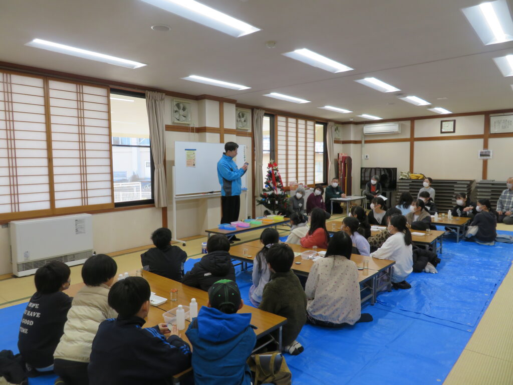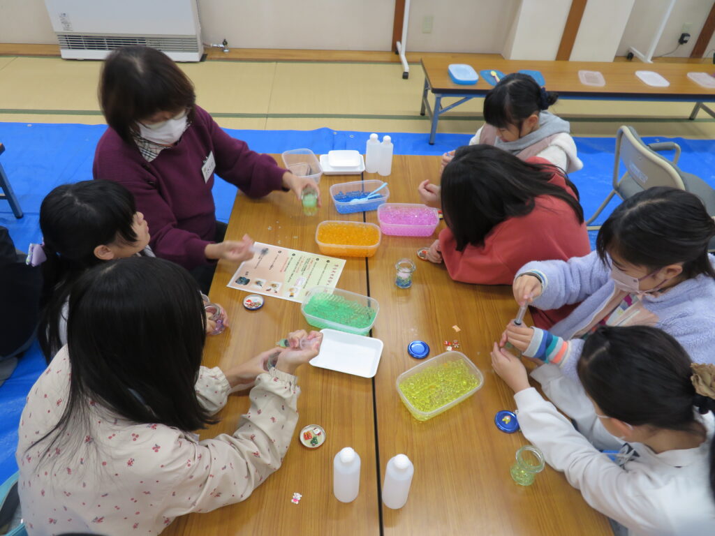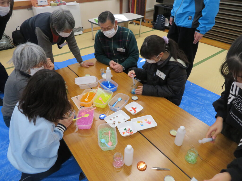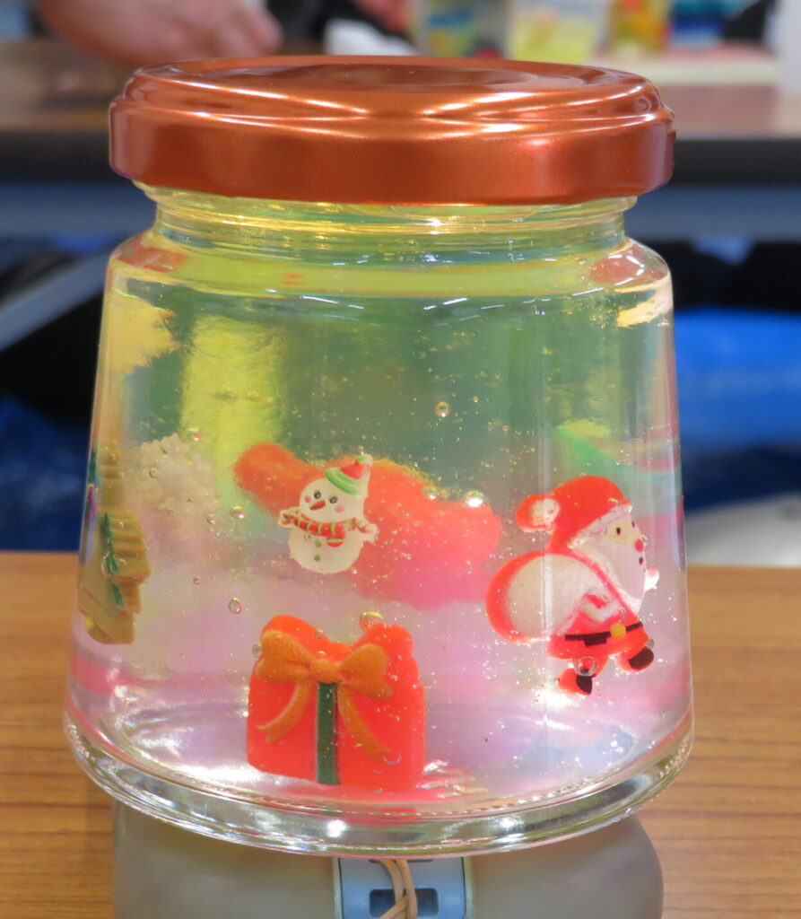 東京電力広報部の勝美さんと山田さんを講師にお迎えし、「クリスマスジェルボトル」を作りました。