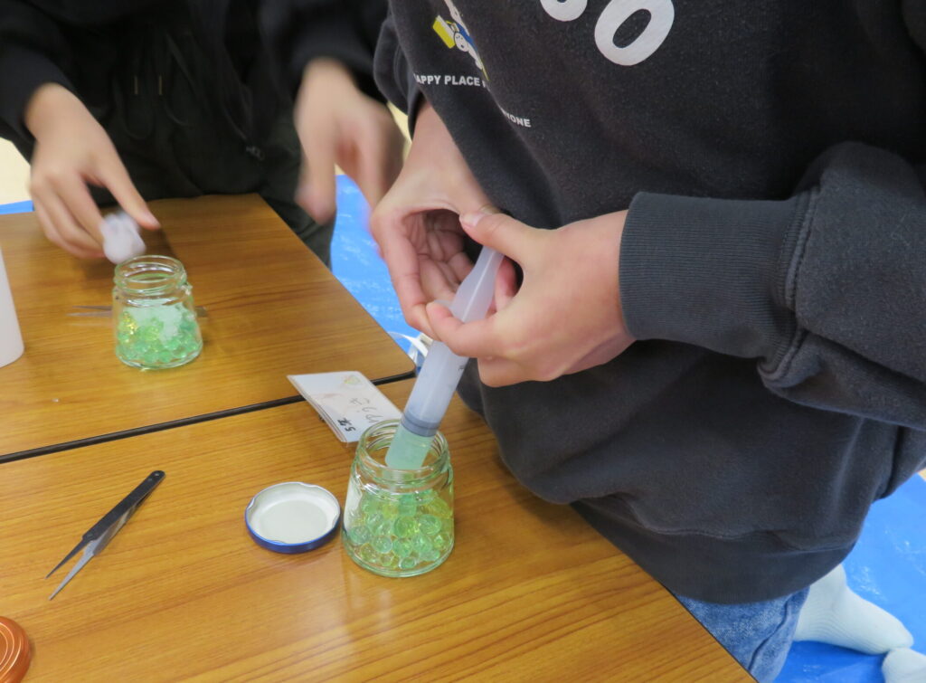 ジェルでできた色付きのボールをそのまま瓶にいれたり、注射器を使って押しつぶして入れました。