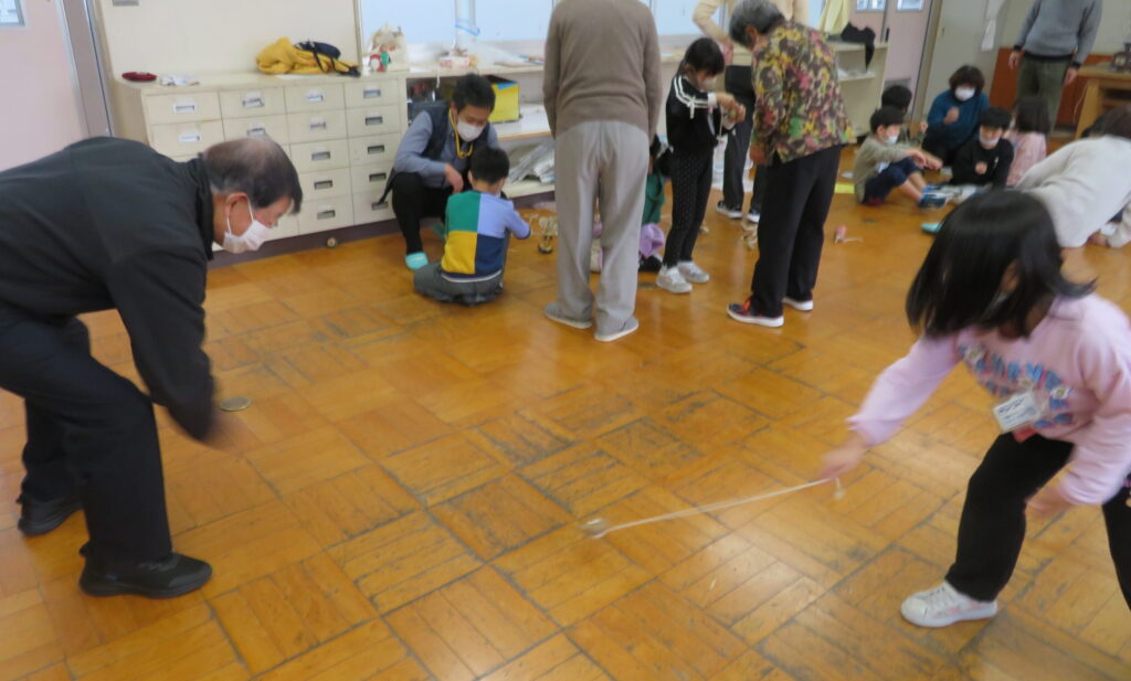 コミセンからは昔のあそび名人のボランティアさん7名に協力してもらい、子どもたちに教えたり一緒に遊んだりしました。