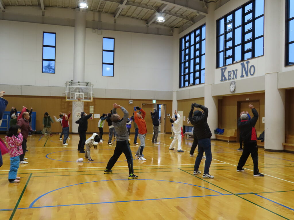 毎年恒例の剣野体協・米山台体協合同の元朝体操会が、元旦の朝7時から剣野コミセンの講堂で行われました。