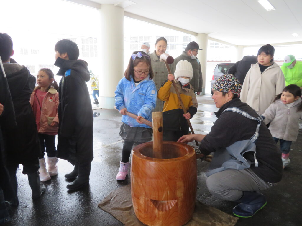 コミセンまで移動し、おもちつきを体験。